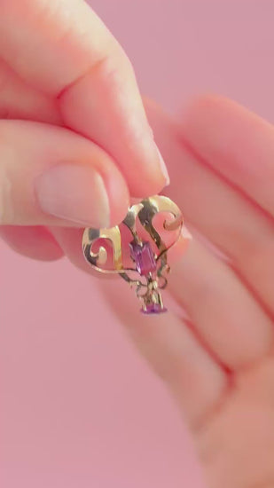 This striking pendant captures the elegance of the Edwardian era, crafted in soft 9ct rose gold with sweeping openwork scrolls and delicate proportions. At its centre rests a rectangular-cut amethyst, glowing with purple vibrancy, while a suspended amethyst drop adds gentle movement and light — hallmarks of the Lavalier style.