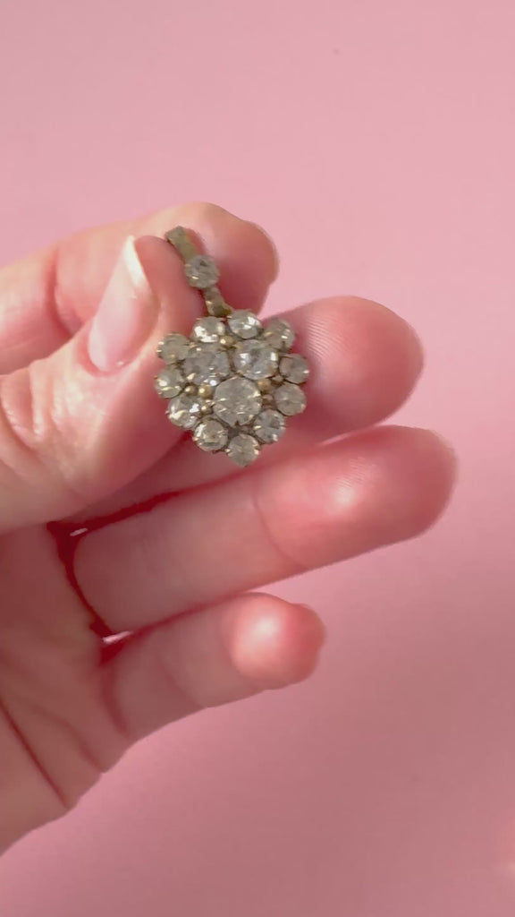 This delicate Victorian pendant is a charming example of late 19th-century jewellery, dating to c.1880s–1890s. It features a cluster of sparkling paste stones set into a warm brass mount, arranged in a classic floral formation designed to catch the light from every angle. This style was especially popular in the late Victorian period, prized for its brilliance and romantic appeal.