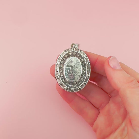 This late Victorian sterling silver oval locket is a finely detailed piece of 19th-century craftsmanship, dating to 1894. The front is intricately engraved with a central oval panel framed by repeating decorative motifs, combining soft floral elements with structured geometric detailing. The naturalistic plants and asymmetrical composition reflect the influence of Japonisme, a design movement that became popular in Britain during the late Victorian period, inspired by Japanese art and engraving.