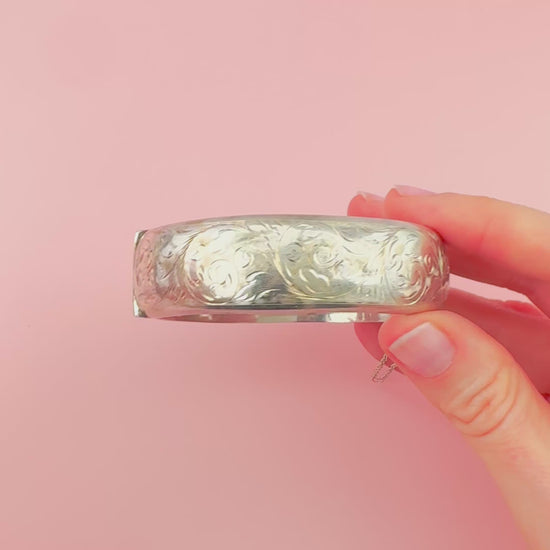 This mid-century sterling silver hinged bangle is a beautifully crafted example of British silversmithing from the post-war period. Designed with a gently oval profile, the bangle is engraved throughout with flowing foliate scrolls and stylised floral motifs, hand-cut into the silver to create depth, movement, and soft contrast against the polished ground. The engraving wraps continuously around the exterior, giving the piece a refined yet decorative presence on the wrist.